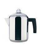 Percolated coffee is an acquired taste, but for those who like it strong and black, this stovetop coffee pot is the way to go. The percolator's polished stainless steel exterior and stepped base give it a vintage look and its brewing methods are strictly old school; however, its construction is completely up to date. Water pours into the bottom of the pot and the pump tube with the filter basket goes in next. Coffee drinkers add their grinds to the filter basket and then place the cover over the basket. Once the lid is tightly secured, the percolator can be put on a gas or electric heat source for brewing. When the water boils, it travels up the pump tube and through the grounds and the familiar sloshing of brown liquid in the lid's transparent plastic knob signifies that percolation has begun. After about 5 to 7 minutes of percolating, coffee is ready for drinking. This pot brews about 4 to 8 cups of coffee and a handy water level indicator etched into the side ensures that brewers add the appropriate amount of water for their grinds. For safety, the plastic handle stays cool over a hot burner and the spout provides dripless pouring. --Cristina Vaamonde